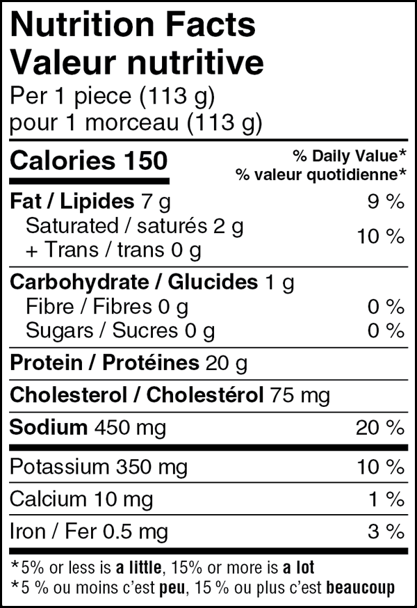 Seasoned chicken breast (chicken breast, water, modified vinegar, dehydrated chicken flavour, cultured cane sugar, cultured dextrose, spices, dehydrated garlic, salt, sodium phosphates, flavour) • Bacon (pork, water, salt, sodium phosphate, sodium erythorbate, sodium nitrite, smoke) • Seasoning (dehydrated garlic, spices, dehydrated red bell pepper). May contain: Eggs.